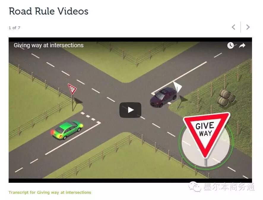 1.维多利亚州路政局(VIC ROAD)官网上公布了关于几项重要道路交通规则的演示视频(如勾型拐弯、十字路口让行标准等),非常实用,可作参考,网址为: