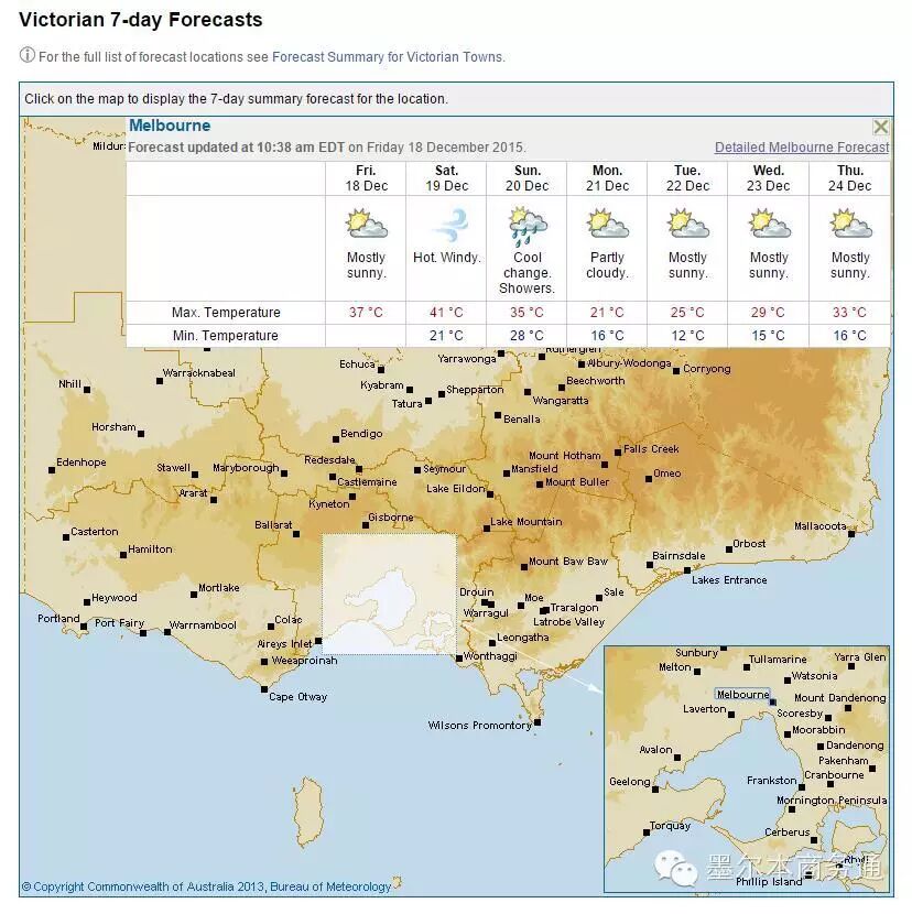 3.天气因素对交通安全也有着较大影响。澳大利亚气象局(bureau of meteorology)网站设有对全境各重点城区及景区的天气预报栏目,可通过互动地图点取相应区域详查未来7日天气状况,除基本概况外,还包括风向、风速、降雨概率、降雨量、预计降雨时间、火灾预警、日晒指数等。可作参考,网址为: