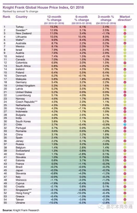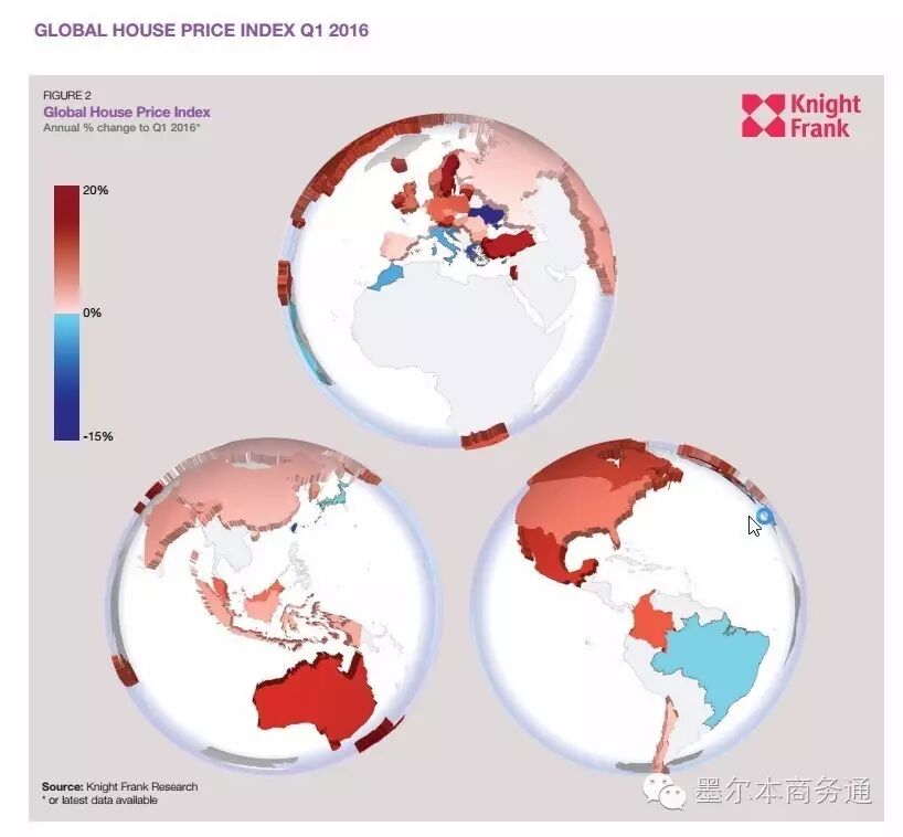 总部设于伦敦的全球知名物业顾问公司Knight Frank日前发布最新一期《全球房价指数报告》(Global House Price Index, Q1 2016)显示,2015年二季度至2016年一季度期间,全球房价综合指数上涨3.4%,其中澳大利亚房价增长8.7%,居土耳其、瑞典、新西兰、立陶宛和马耳他之后,在55个取样国家中排名第6名,较上年下滑2位。