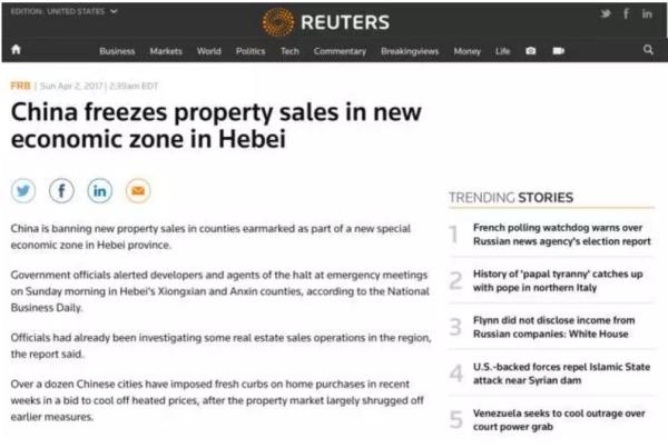 路透社报道称,河北雄安新区楼市冻结。报道提到,中国多个城市出台了防止楼市过热的限购政策,购房者外溢至房价更低的北京周边城市。报道援引当地政府消息称,雄安新区已着手研究区域内房地产政策。
