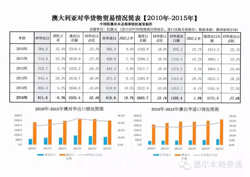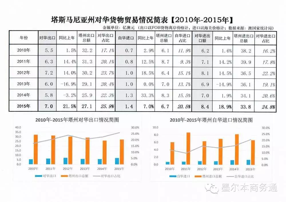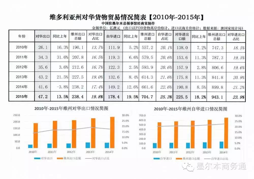 澳大利亚国家统计局于2016年2月初发布了2015年度外贸统计明细数据,驻墨尔本总领馆经商室对全澳、维州、塔州对华贸易数据进行了提炼整理,制作了《澳大利亚对华货物贸易情况简表(2010-2015年度)》等3张图表,内容涵盖对华货物出口、进口、进出口的金额、同比及比重等。从报表数据看,2015年我馆领区的维州、塔州两地对华货物进出口均呈良好增长态势,双边贸易额占当地外贸总量比重继续上升。具体情况如下,供参考。