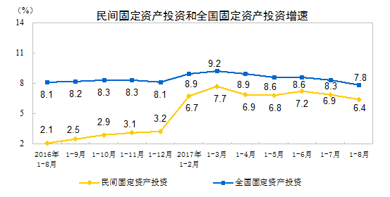 2017年1-8月份,民间固定资产投资239148亿元,同比名义增长6.4%,增速比1-7月份回落0.5个百分点。民间固定资产投资占全国固定资产投资(不含农户)的比重为60.7%,与1-7月份持平。