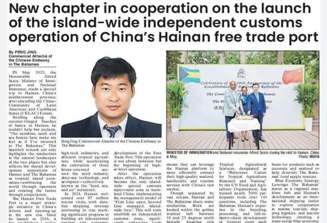 卫生&社会驻巴哈马使馆经商工作负责人发表署名文章《海南自贸港封关运作 开启中巴合作新篇章》